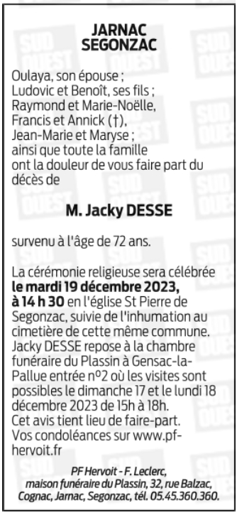 Décédé à Jarnac (16200) le vendredi 15 décembre 2023