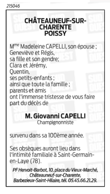 Cet espace « condoléances » est dédié à la mémoire de Monsieur Giovanni CAPELLI.