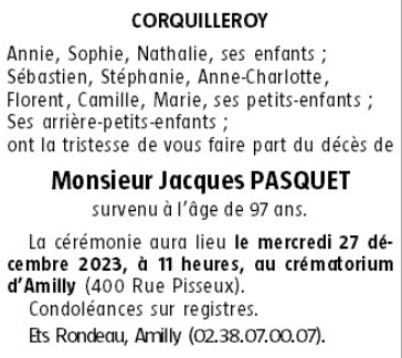 Cet espace « condoléances » est dédié à la mémoire de Monsieur Jacques PASQUET.