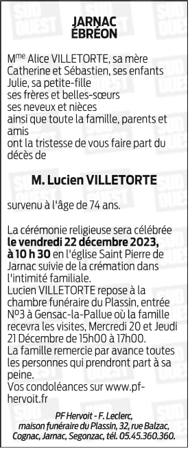 Cet espace « condoléances » est dédié à la mémoire de Monsieur Lucien VILLETORTE.