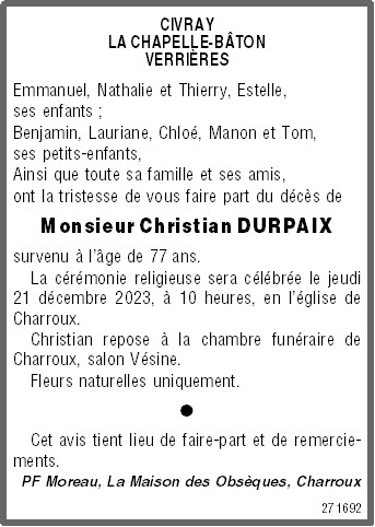Cet espace « condoléances » est dédié à la mémoire de Monsieur Christian DURPAIX.