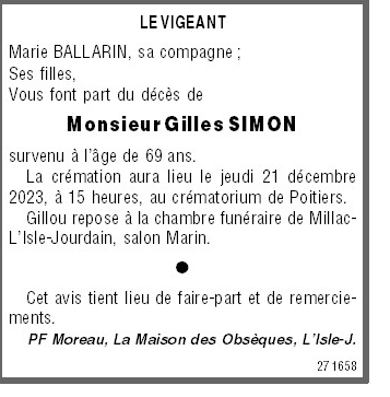 Décédé à Le Vigeant (86150) le samedi 16 décembre 2023