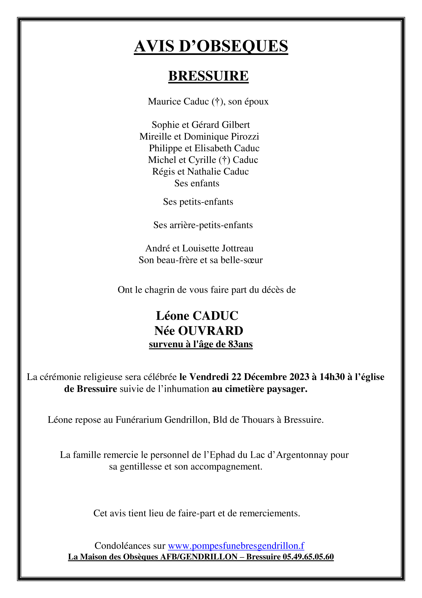 de Madame Léone CADUC née OUVRARD