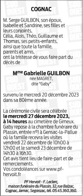 Cet espace « condoléances » est dédié à la mémoire de Madame Gabrielle GUILBON née MAGRET.