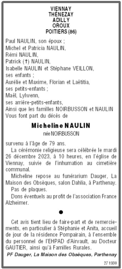 Cet espace « condoléances » est dédié à la mémoire de Madame Micheline NAULIN née NOIRBUSSON.