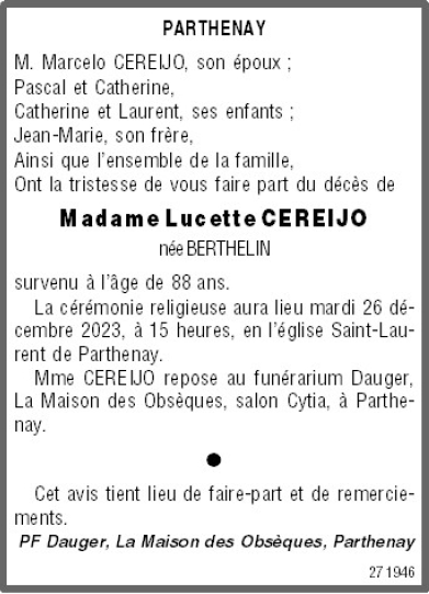 Cet espace « condoléances » est dédié à la mémoire de Madame Lucette CEREIJO née BERTHELIN.