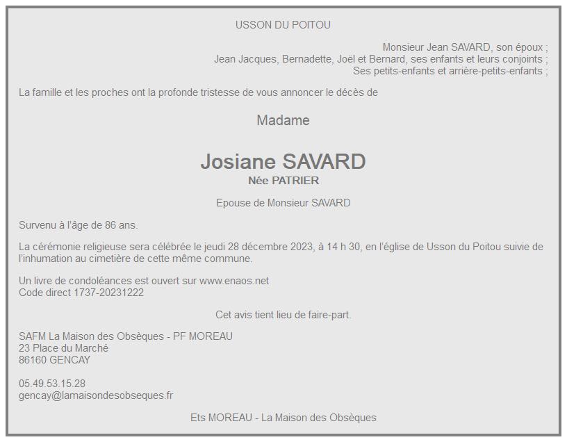 de Madame Josiane SAVARD née PATRIER