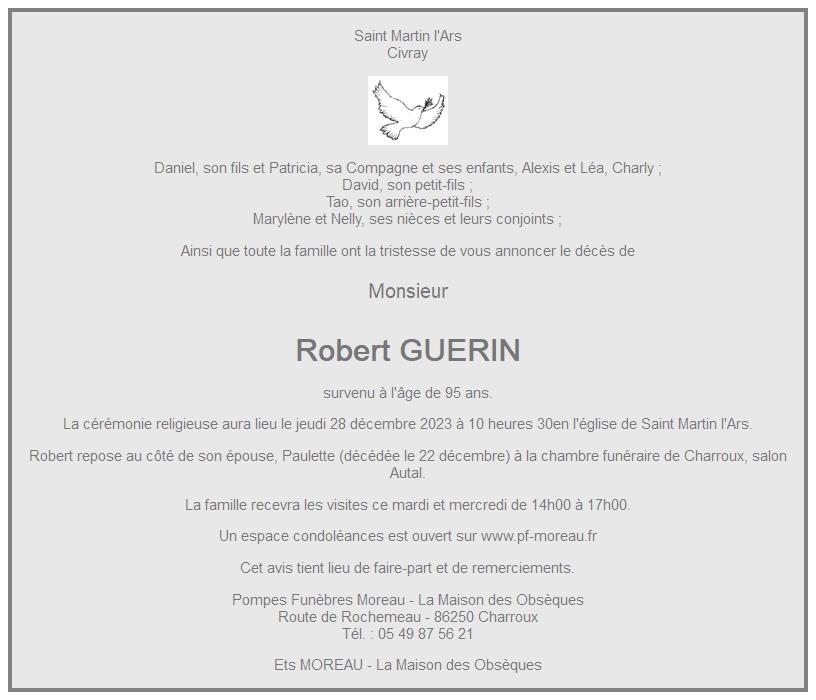 Cet espace « condoléances » est dédié à la mémoire de Monsieur Robert GUERIN.