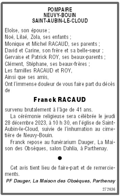 Cet espace « condoléances » est dédié à la mémoire de Monsieur Franck RACAUD.