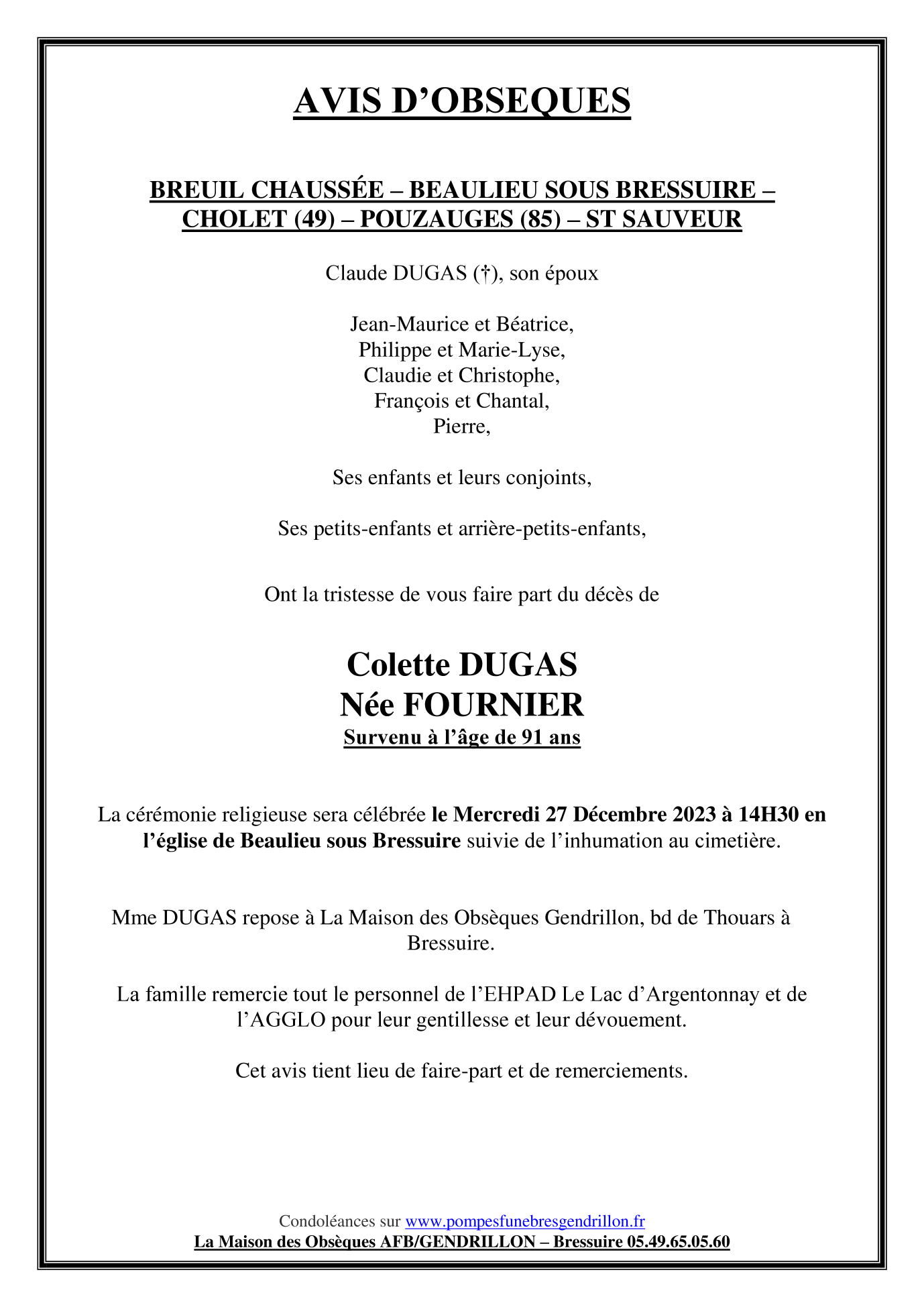 Cet espace « condoléances » est dédié à la mémoire de Madame Colette DUGAS née FOURNIER.