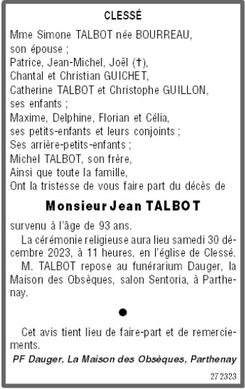 Cet espace « condoléances » est dédié à la mémoire de Monsieur Jean TALBOT.