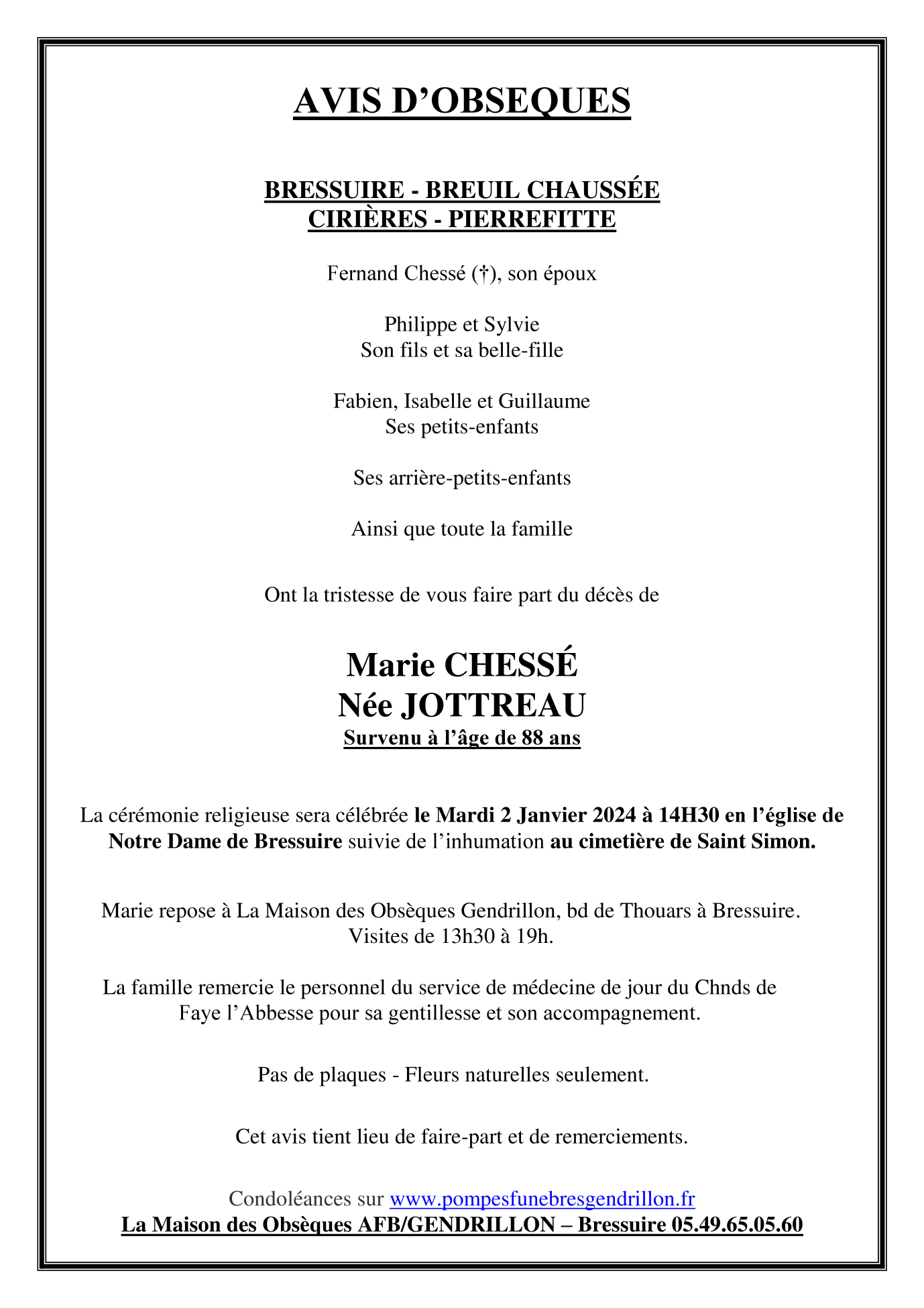 Cet espace « condoléances » est dédié à la mémoire de Madame Marie CHESSÉ née JOTTREAU.