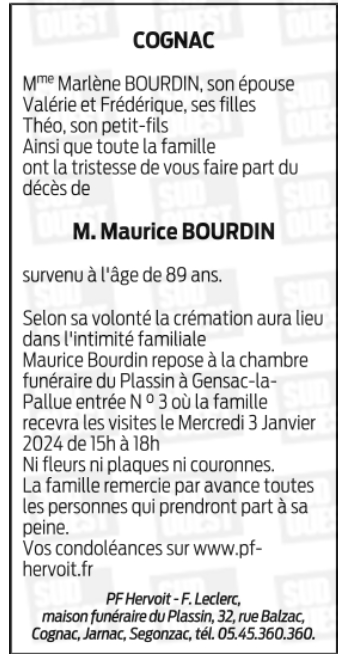 Décédé à Cognac (16100) le vendredi 29 décembre 2023