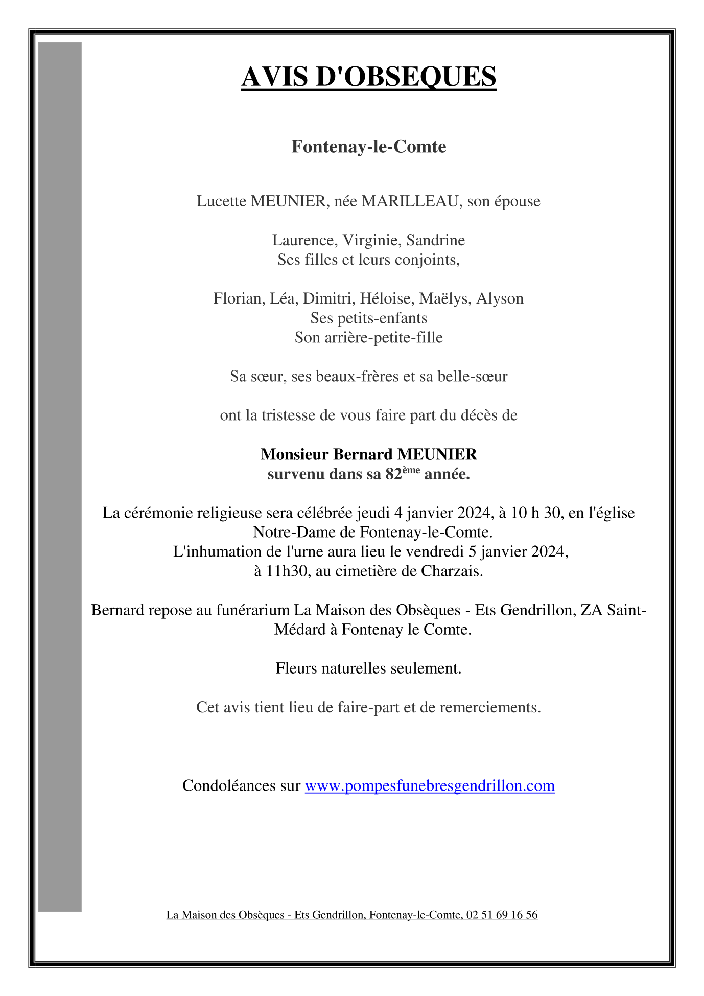 Cet espace « condoléances » est dédié à la mémoire de Monsieur Bernard MEUNIER.