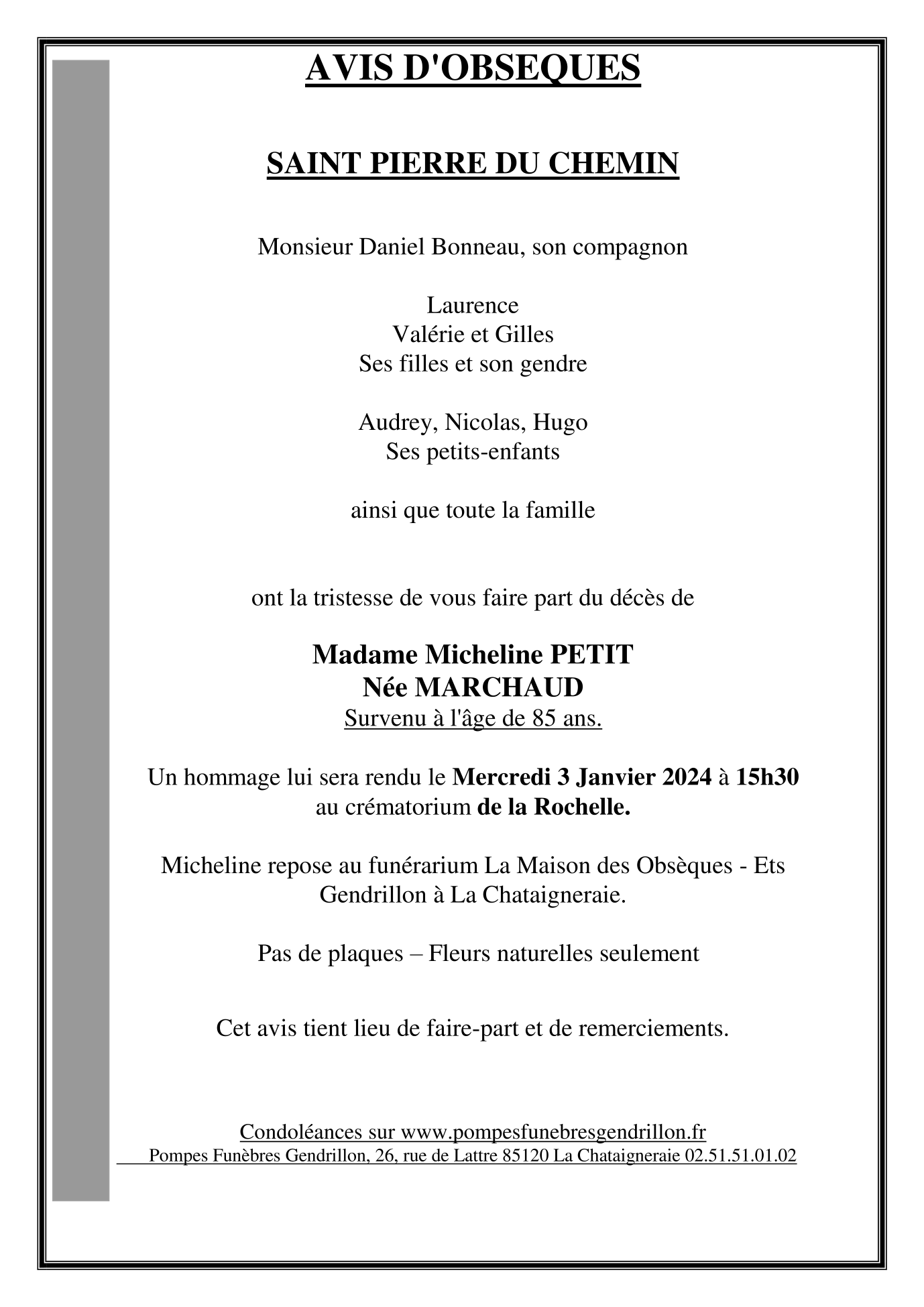 Cet espace « condoléances » est dédié à la mémoire de Madame MICHELINE PETIT née MARCHAUD.