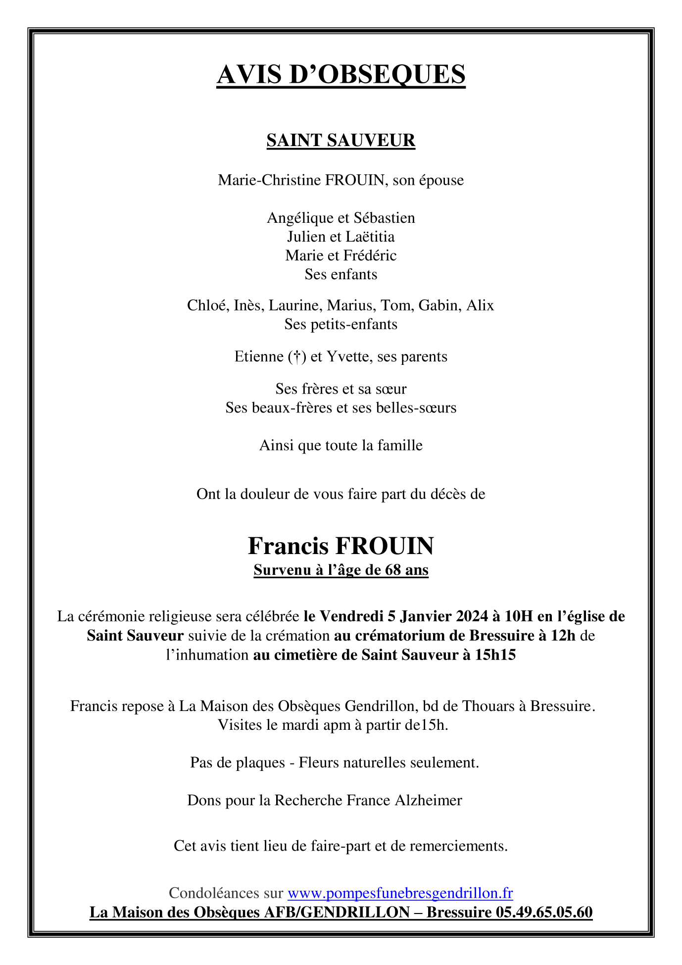 Cet espace « condoléances » est dédié à la mémoire de Monsieur Francis FROUIN.