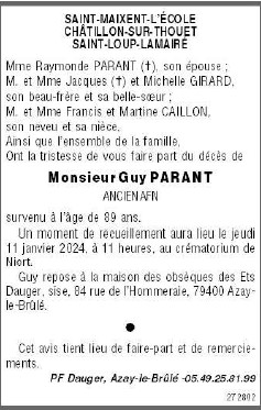 Cet espace « condoléances » est dédié à la mémoire de Monsieur GUY PARANT.