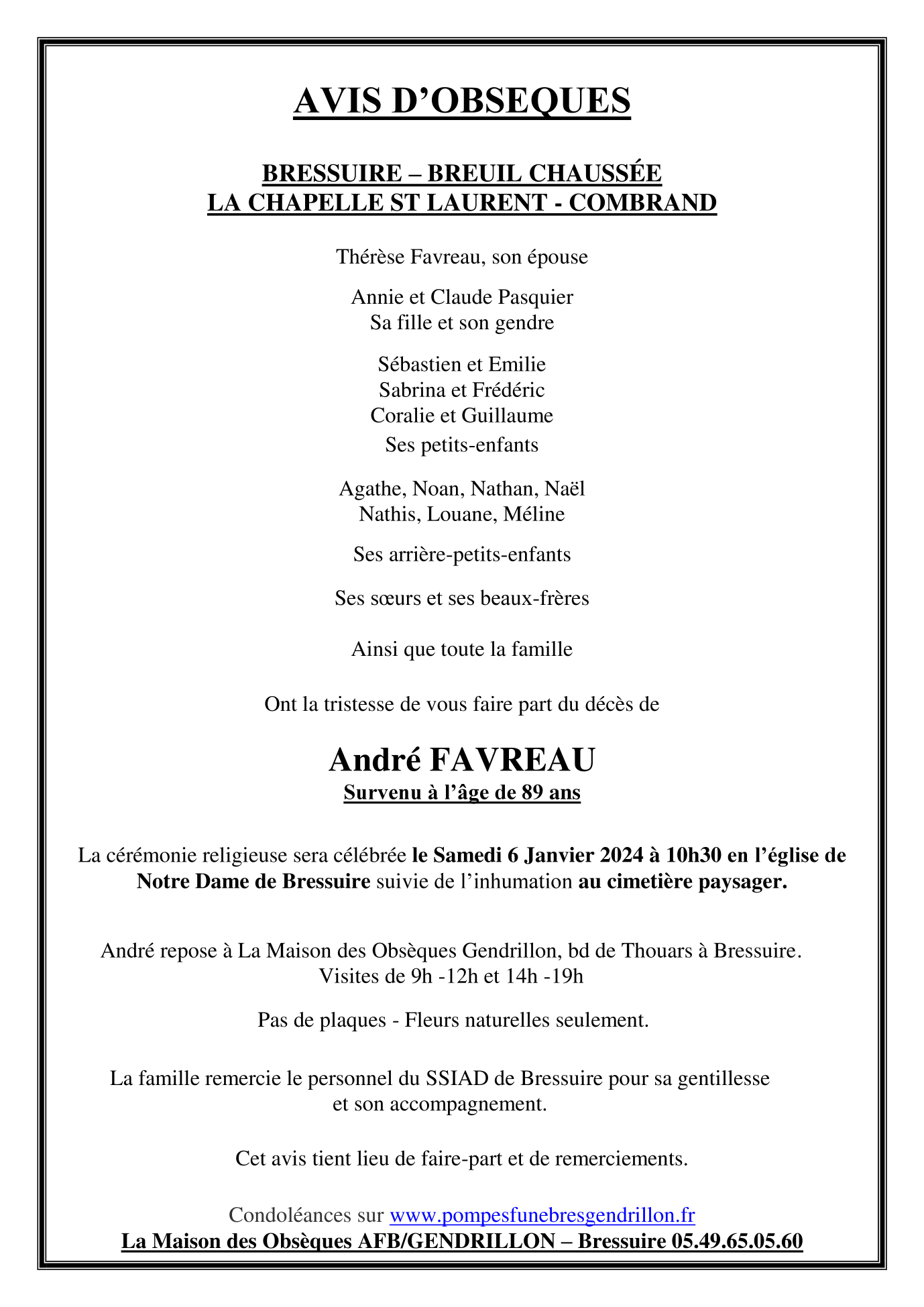 Cet espace « condoléances » est dédié à la mémoire de Monsieur André FAVREAU.