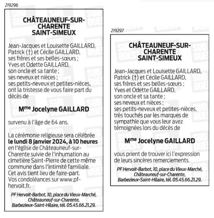 Cet espace « condoléances » est dédié à la mémoire de Madame Jocelyne GAILLARD.