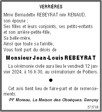 Cet espace « condoléances » est dédié à la mémoire de Monsieur Jean Louis REBEYRAT.
