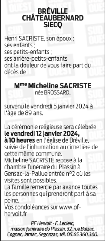 Cet espace « condoléances » est dédié à la mémoire de Madame Micheline SACRISTE née BROSSARD .