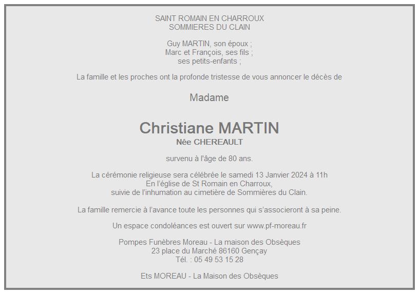 Cet espace « condoléances » est dédié à la mémoire de Madame Christiane MARTIN née CHEREAULT.