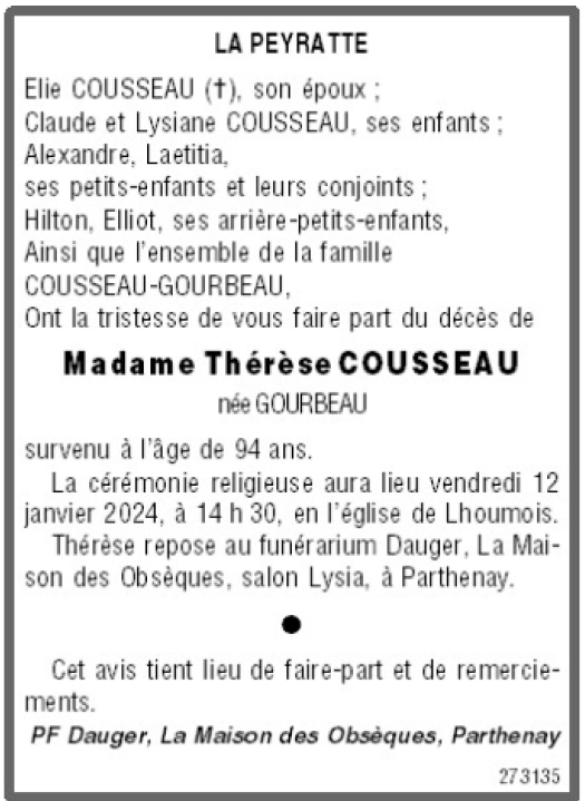 de Madame Thérèse COUSSEAU née GOURBEAU