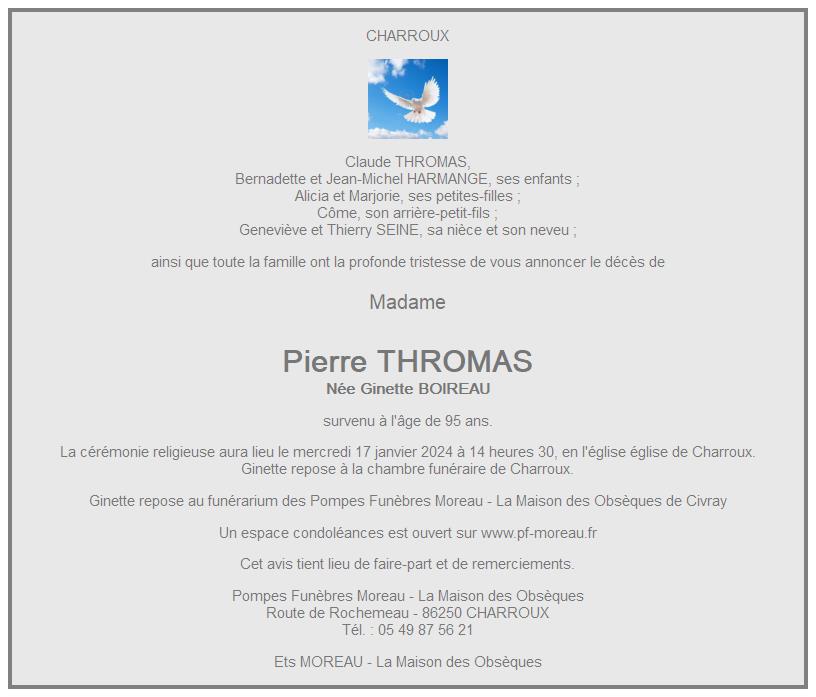 Cet espace « condoléances » est dédié à la mémoire de Madame Ginette THROMAS née BOIREAU.
