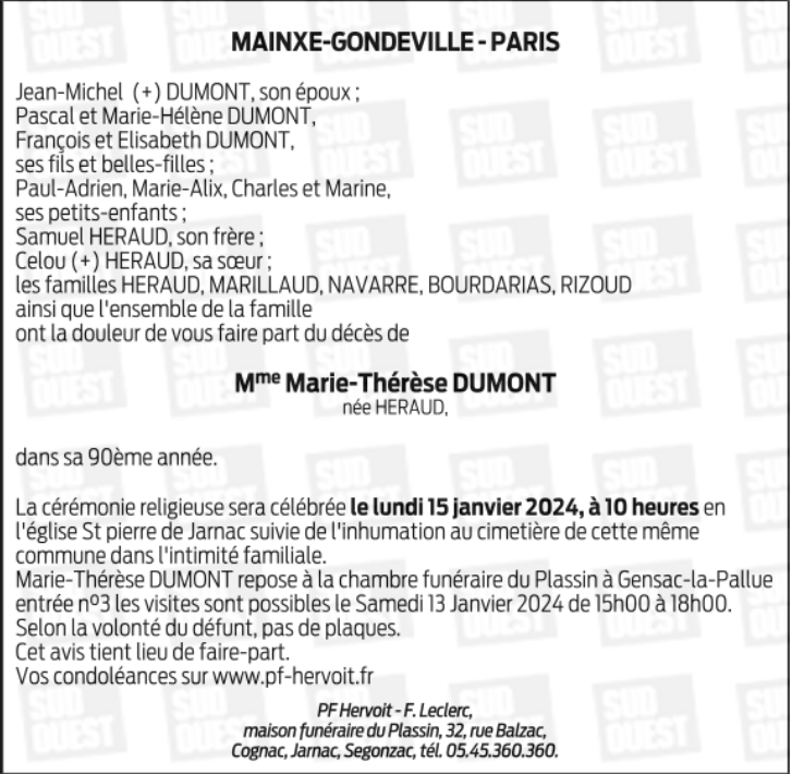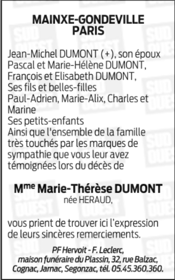 de Madame Marie-Thérèse DUMONT née HERAUD