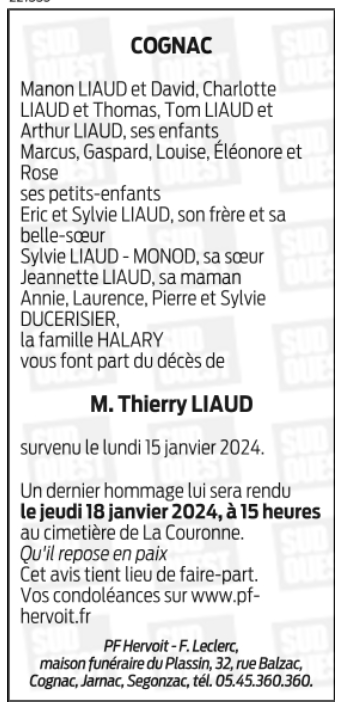 Cet espace « condoléances » est dédié à la mémoire de Monsieur Thierry LIAUD.