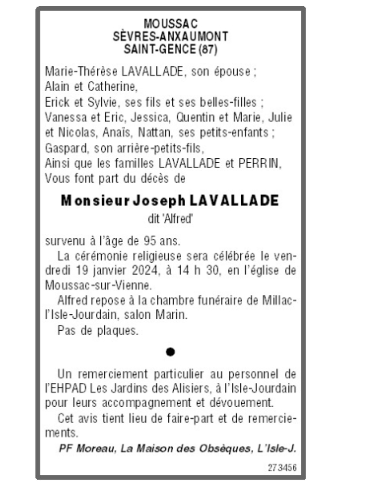Cet espace « condoléances » est dédié à la mémoire de Monsieur Joseph LAVALLADE.