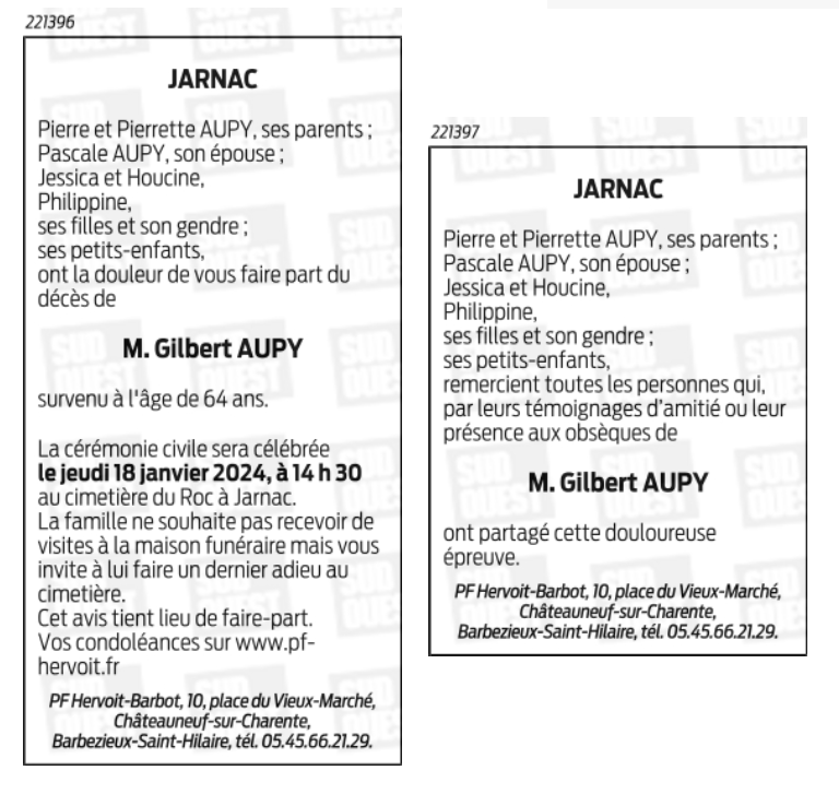 Cet espace « condoléances » est dédié à la mémoire de Monsieur Gilbert AUPY.