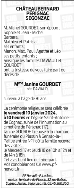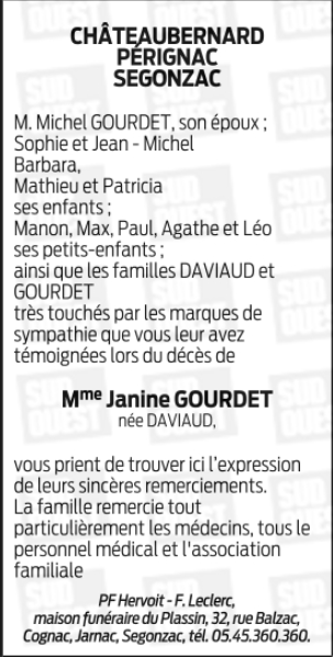 Cet espace « condoléances » est dédié à la mémoire de Madame Janine, Renée GOURDET.