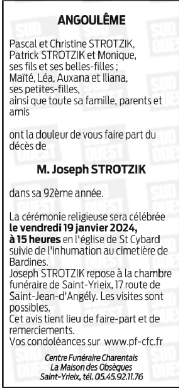 Cet espace « condoléances » est dédié à la mémoire de Monsieur Joseph STROTZIK.
