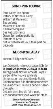 Cet espace « condoléances » est dédié à la mémoire de Madame Colette LALAY née AUZANNEAU.
