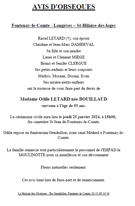 Cet espace « condoléances » est dédié à la mémoire de Madame Odile BOUILLAUD.
