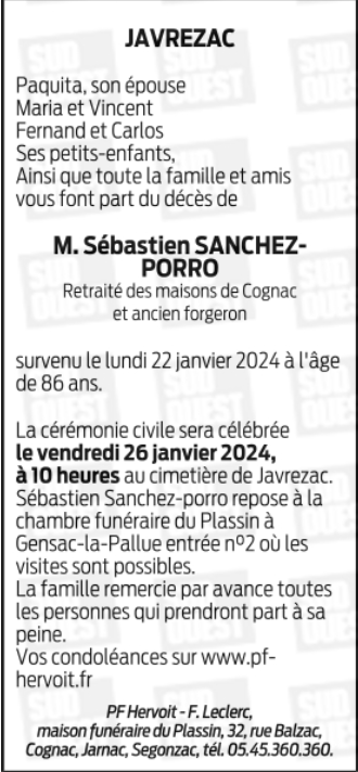 Décédé à Javrezac (16100) le lundi 22 janvier 2024