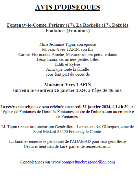 Cet espace « condoléances » est dédié à la mémoire de Monsieur Yves TAPIN.