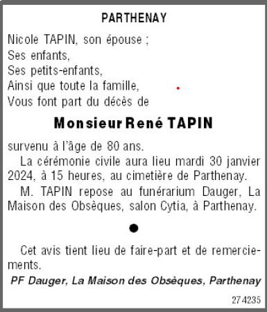 Cet espace « condoléances » est dédié à la mémoire de Monsieur René TAPIN.