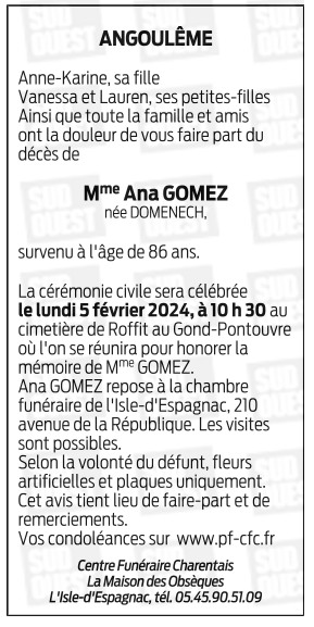 Cet espace « condoléances » est dédié à la mémoire de Madame Ana GOMEZ née DOMENECH.