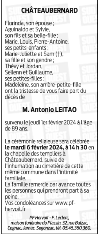 Cet espace « condoléances » est dédié à la mémoire de Monsieur Antonio LEITAO.