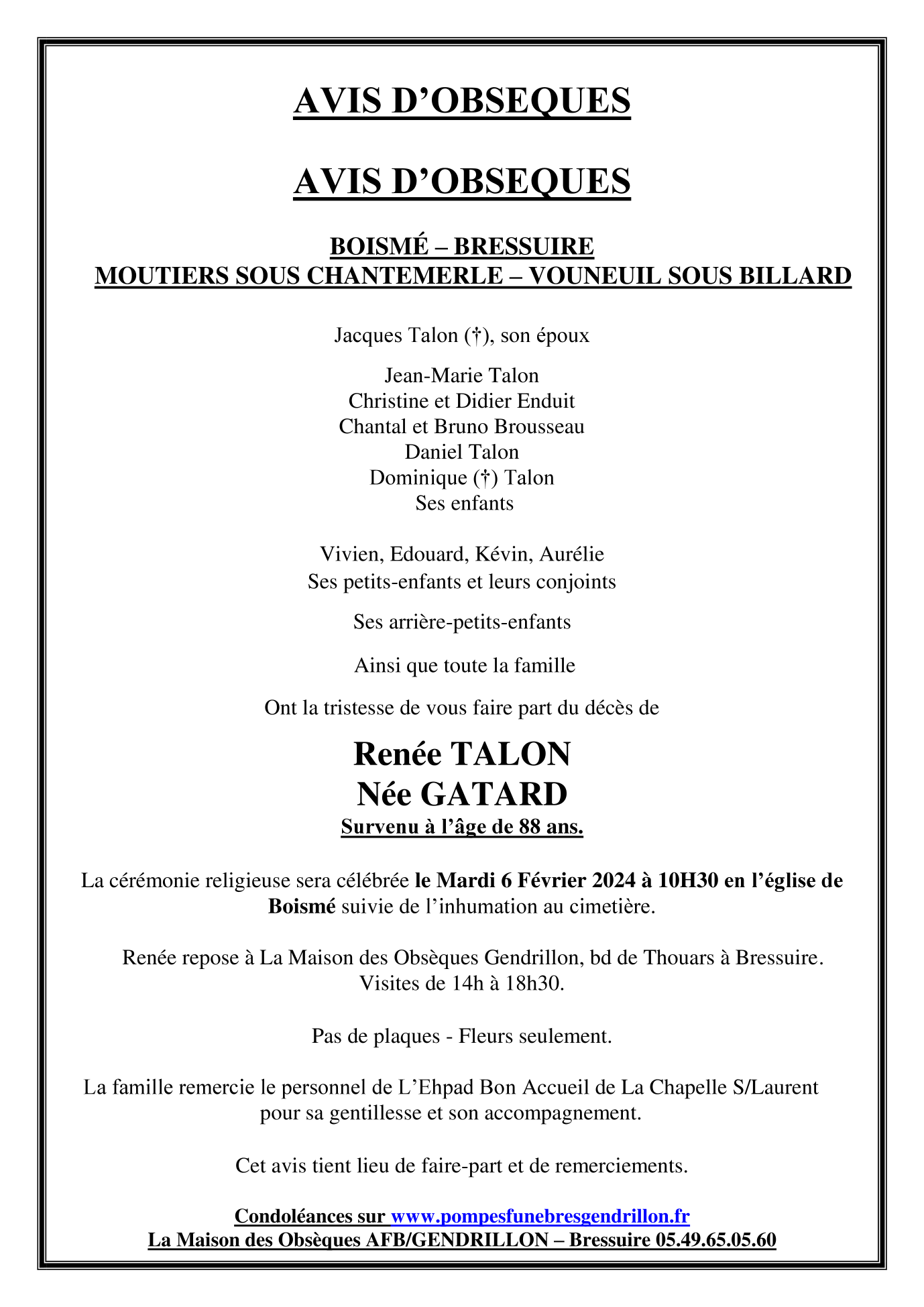 de Madame Renée TALON née GATARD
