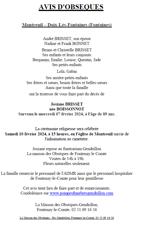 Cet espace « condoléances » est dédié à la mémoire de Madame Josiane BRISSET née BOISSONNOT.