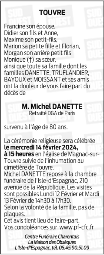 Cet espace « condoléances » est dédié à la mémoire de Monsieur MICHEL DANETTE.