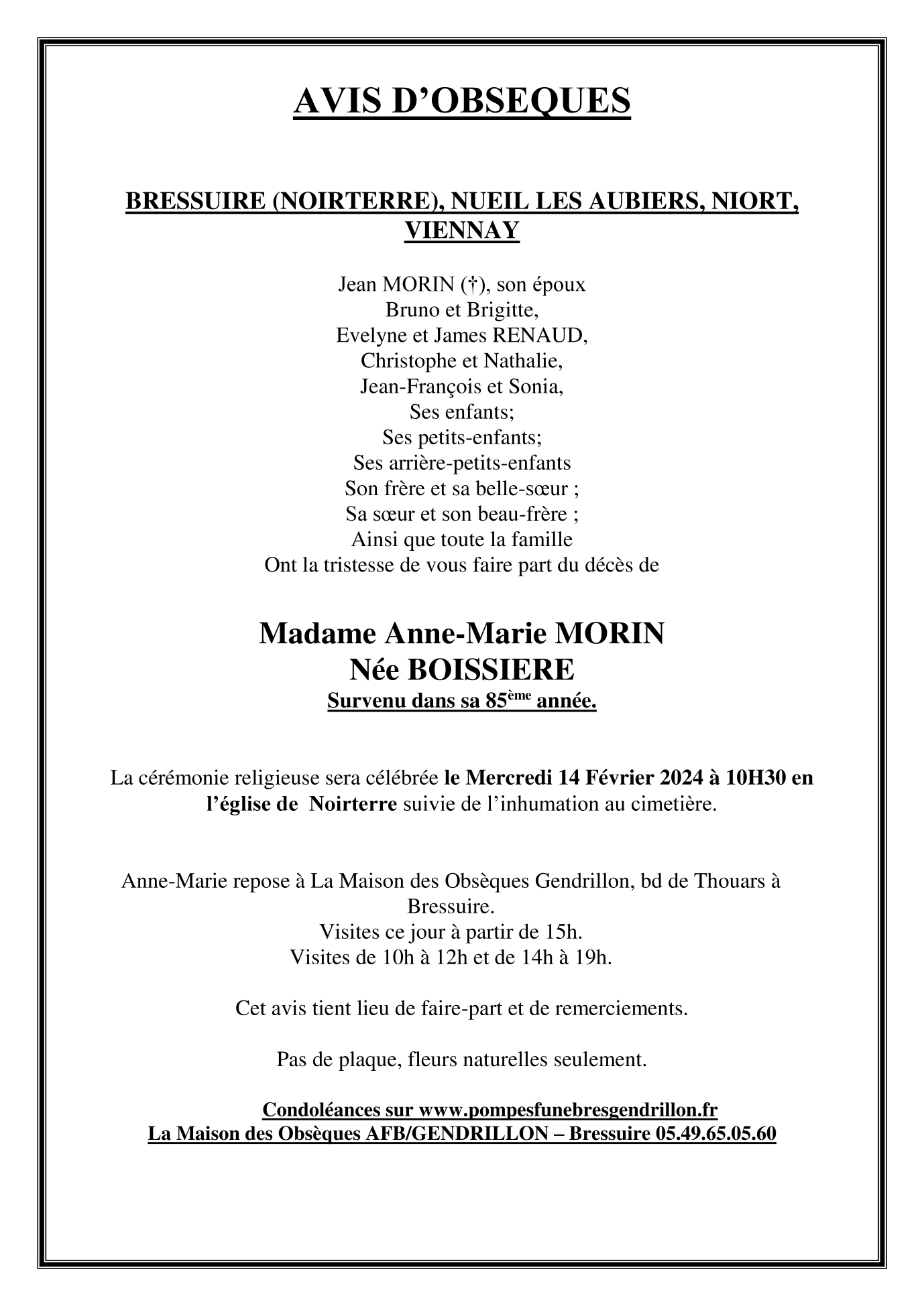 de Madame Anne-Marie MORIN née BOISSIÈRE