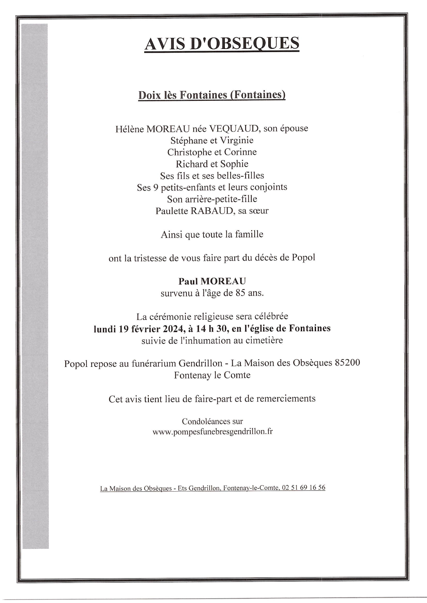 Décédé à Fontenay-le-Comte (85200) le jeudi 15 février 2024