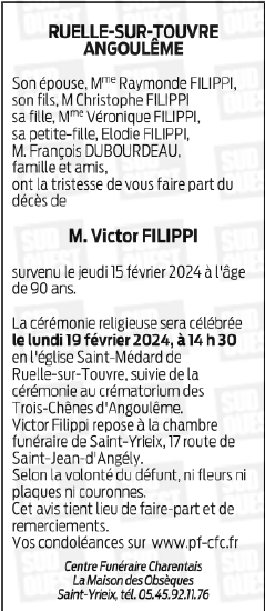 Cet espace « condoléances » est dédié à la mémoire de Monsieur Victor FILIPPI.