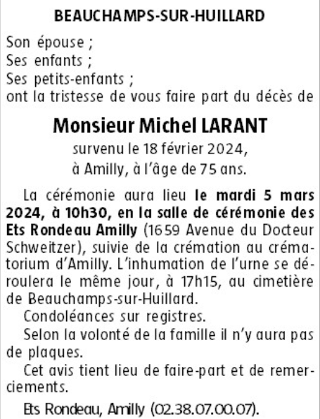 Cet espace « condoléances » est dédié à la mémoire de Monsieur Michel LARANT.