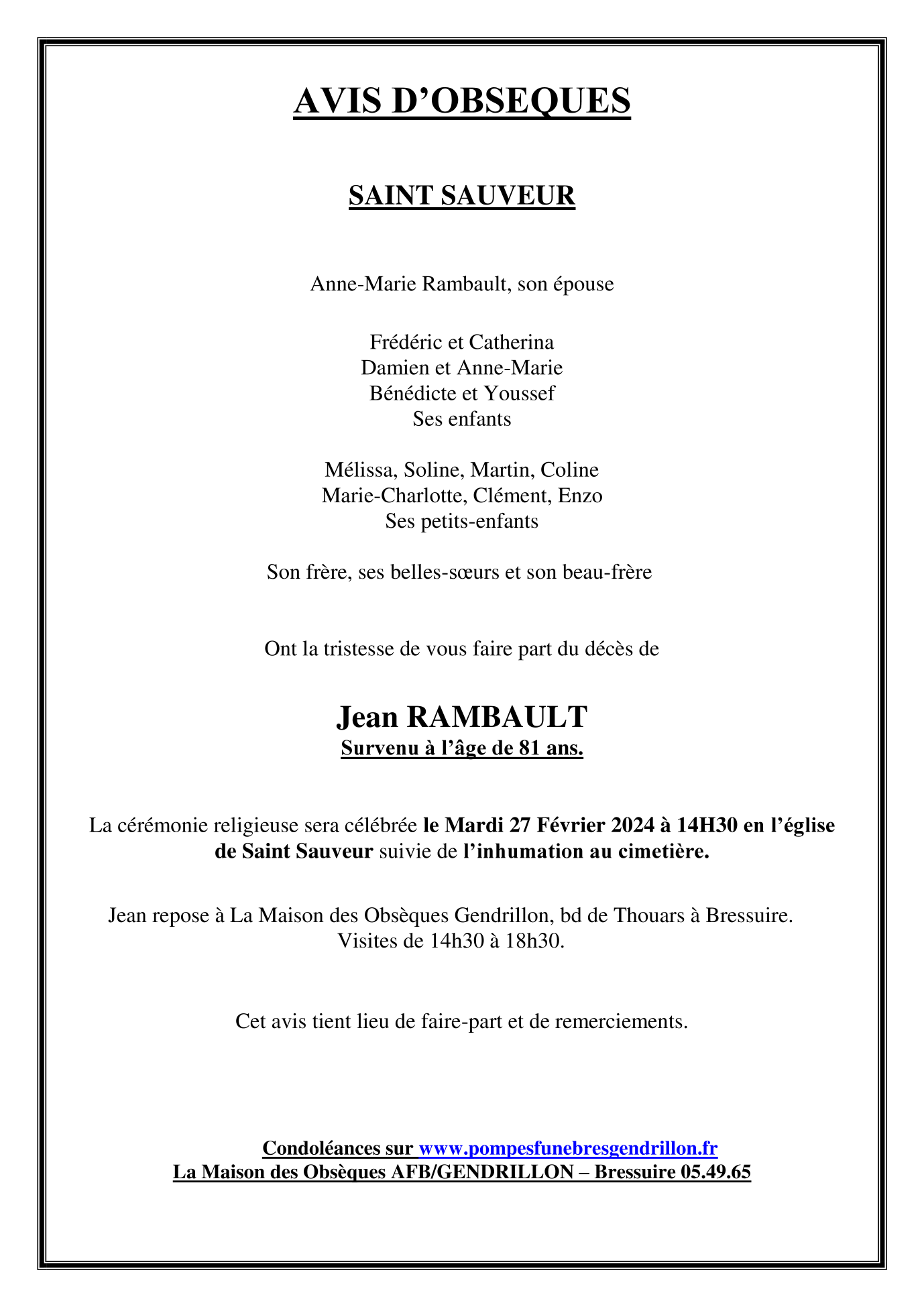 Cet espace « condoléances » est dédié à la mémoire de Monsieur Jean RAMBAULT.