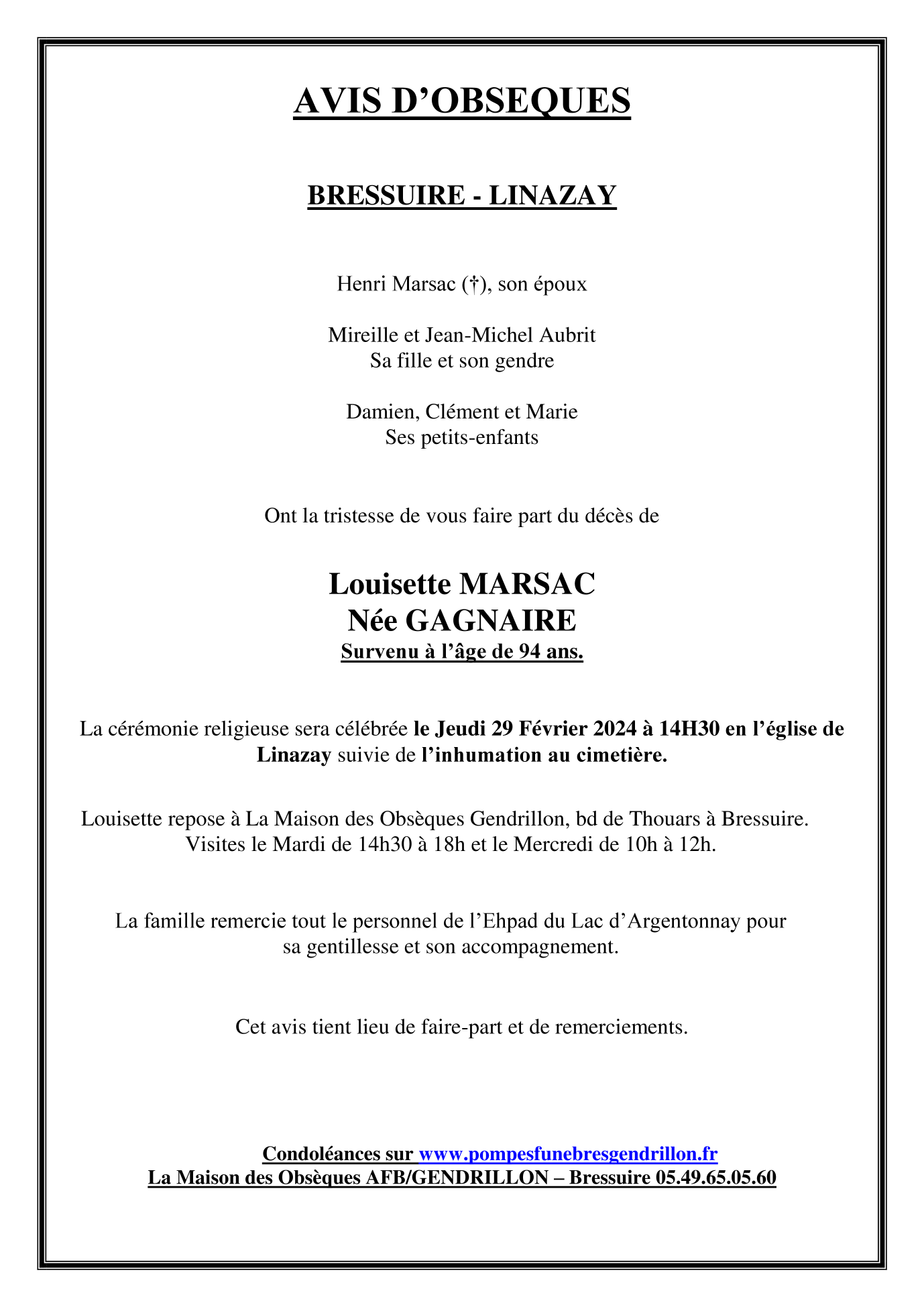 de Madame LOUISETTE MARSAC née GAGNAIRE